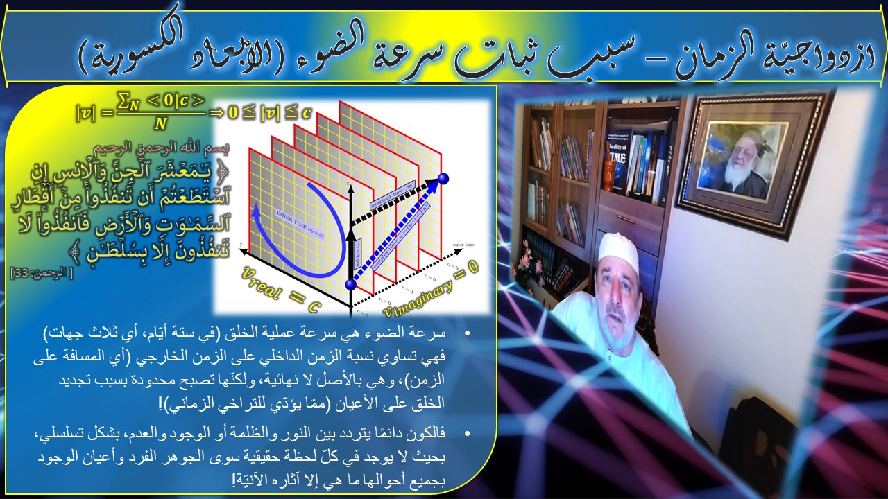 وبهذا الاعتبار تكون سرعة الضوء هي نفسها الأبعاد الكسورية للفراغ، وتكون الآية القرآنية في سورة الرحمن: ﴿ يَٰمَعۡشَرَ ٱلۡجِنِّ وَٱلۡإِنسِ إِنِ ٱسۡتَطَعۡتُمۡ أَن تَنفُذُواْ مِنۡ أَقۡطَارِ ٱلسَّمَٰوَٰتِ وَٱلۡأَرۡضِ فَٱنفُذُواْۚ لَا تَنفُذُونَ إِلَّا بِسُلۡطَٰنٖ ﴾ [ الرحمن: 33] تعبير مباشر عن النظرية النسبية، لأنّ أقطار السموات والأرض هي نفسها سرعة الخلق أو سرعة الضوء عندما تكون زمن على زمان (بدلا من مكان على زمان) !