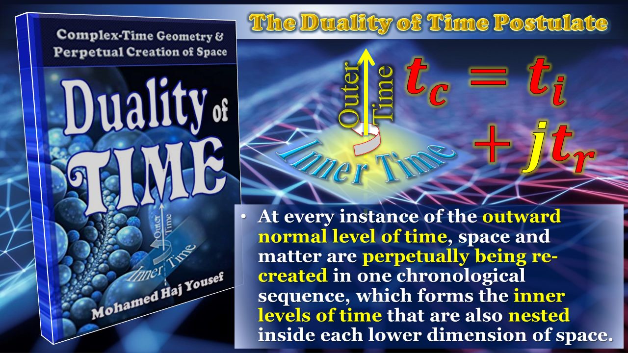 The Duality of Time Postulate states that: "At every instance of the outward normal level of time, space and matter are perpetually being re-created in one chronological sequence, which forms the inner levels of time that are also nested inside each lower dimension of space. "