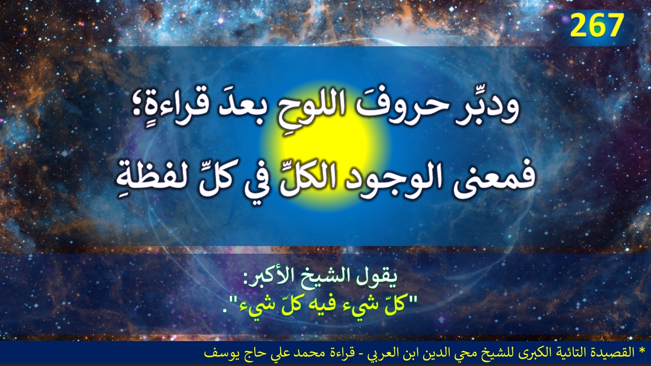 Timeline photosيقول سيدي الشيخ الأكبر محي الدين ابن العربي في الباب الثاني من الفتوحات المكية: ... اعلم أن مبادئ السُّوَرِ المجهولة لا يعرف حقيقتها إلا أهل الصُّور المعقولة. ... فجعلها تبارك وتعالى تسعاً وعشرين سورة، وهو كمال الصُّورة؛ ... وجملتها على تكرار الحروف ثمانية وسبعون حرفاً؛ فالثَّمانية (هي) حقيقة البِضع. قال عليه السلام: "الإيمان بضعٌ وسبعون"، وهذه الحروف ثمانية وسبعون حرفاً، فلا يُكمل عبدٌ أسرارَ الإيمان حتى يعلمَ حقائِق هذه الحروف في سُوَرها. ... كما إنَّه إذا علمها من غير تكرار عَلِم تنبيه الله فيها على حقيقة الإيجاد وتفرُّدِ القديم سبحانه بصفاته الأزليَّة؛ فأرسلها في قرآنه أربعة عشر حرفاً مُفْرَدَةً مُبْهَمَةً، فجعل الثَّمانية لمعرفة الذَّات والسَّبع الصِّفات منَّا، وجعل الأربعة للطَّبائع المؤلَّفة ... ثم إنه سبحانه جعل أوَّلها الأَلِفُ في الخطِّ (أي الرّقْم) والهمزة في اللَّفظ، وآخرها النُّون. فالأَلِفُ لوجود الذَّاتِ على كمالِها لأنها غيرُ مفتقرة إلى حركة. والنُّون لوُجود الشَّطرِ من العالَم (أي نصفُه السُّفلي الظّاهر)، وهو عالَم التَّركيب؛ وذٰلك نصف الدائرة الظاهرة لنا من الفَلَك، والنِّصفُ الآخرُ (هو) النُّونُ المعقولة عليها الَّتي لو ظهرت للحِسِّ وانتقلت من عالَم الرُّوح لكانت دائرةً محيطة، ولكن أخفى (الله تعالى) هذه النُّونَ الرُّوحانيَّة الَّذي بها كمال الوجود، وجُعلت نقطةُ النُّون المحسوسة دالَّة عليها.