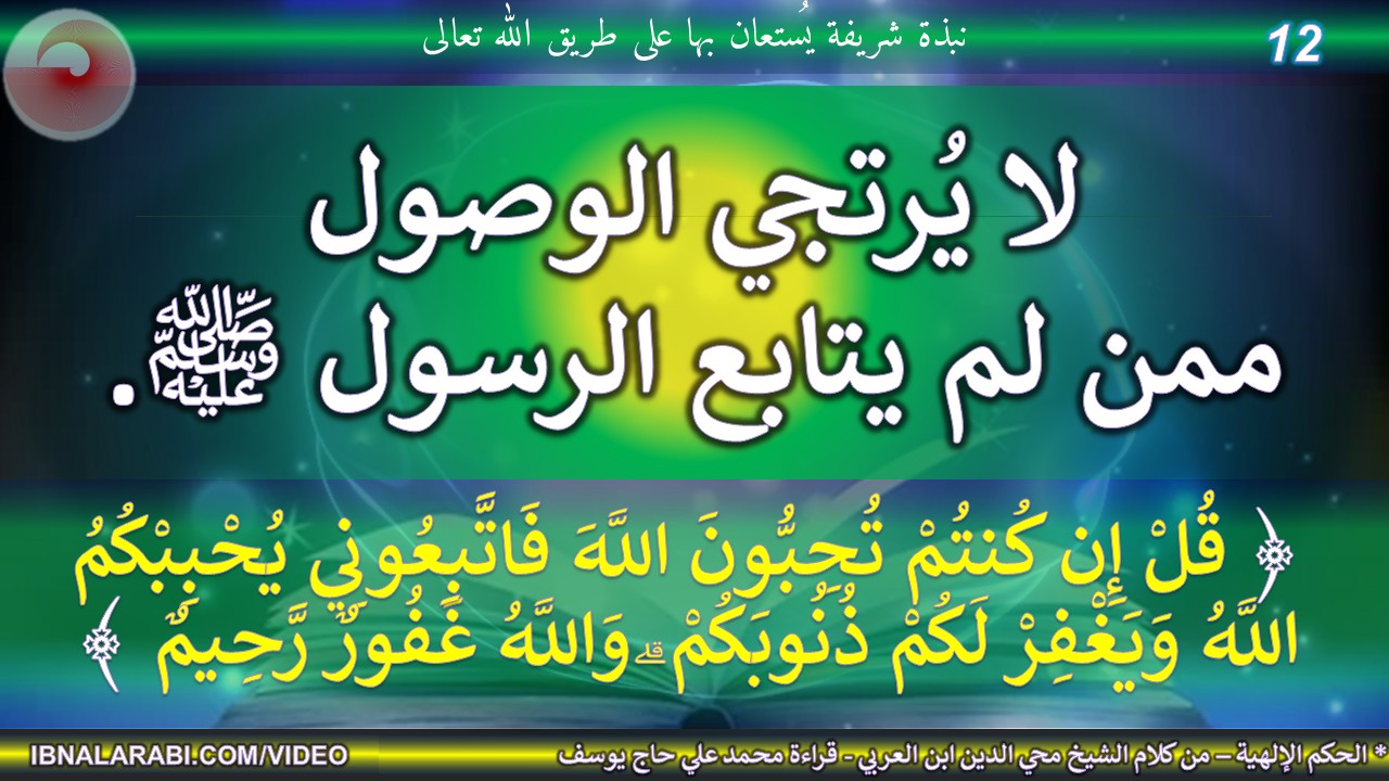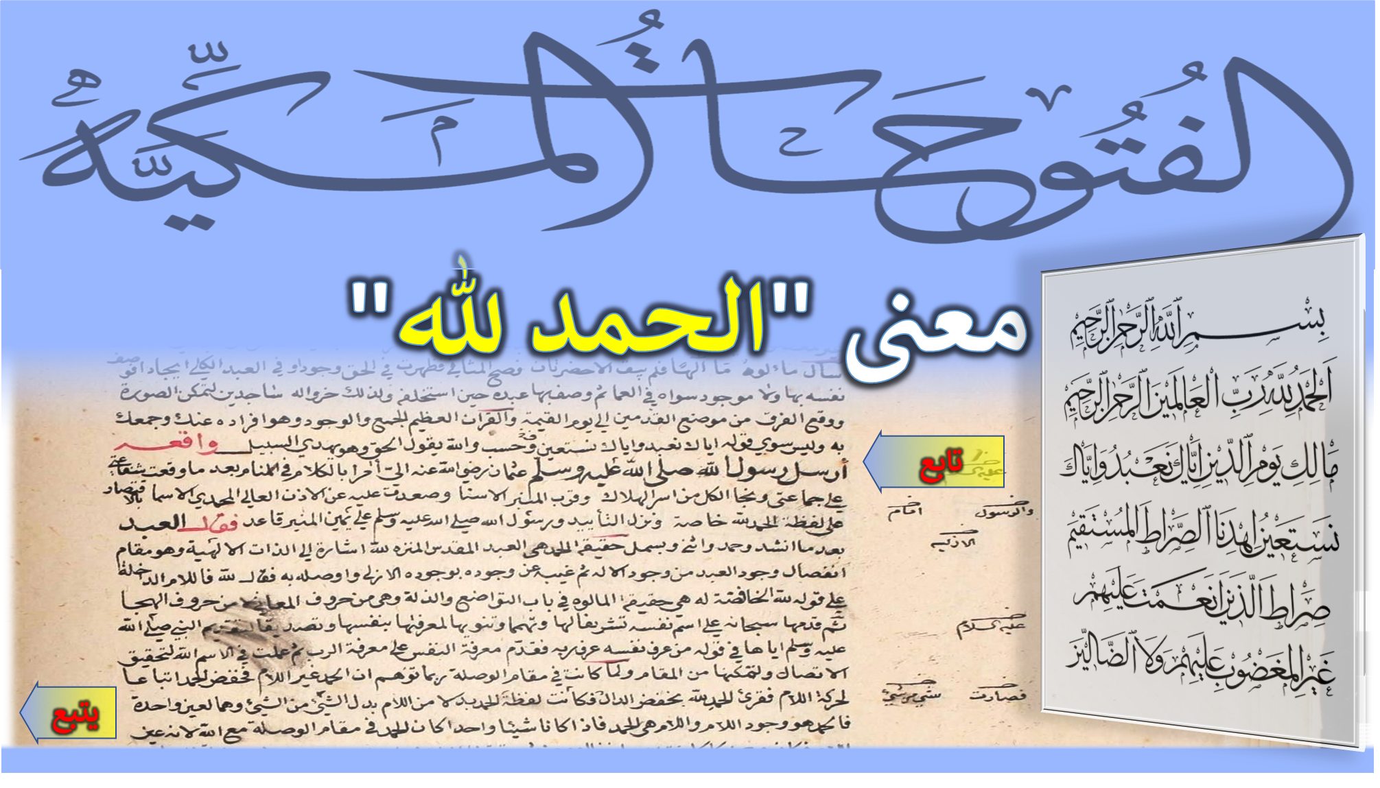 Timeline photosبشارة من الشيخ الأكبر سيدي محي الدين ابن العربي لجماعته، يقول في الباب الخامس من الفتوحات المكية في معرفة فاتحة الكتاب وأم القرآن: (واقعة [أي رؤيا]) أرسل رسول الله صلى الله عليه وسلم عثمان رضي الله عنه إليَّ آمرًا بالكلام، في المنام، بعد ما وقعت شفاعتي على جماعتي ونجا الكلُّ من أسر الهلاك، وقُرّب المنبر الأسنى وصعدت عليه عن الإذن العالي المحمدي الأسمى بالاقتصار على لفظة الحمد لله خاصة ونزل التأييد ورسول الله صلى الله عليه وسلم عن يمين المنبر قاعد، فقال العبد، بعد ما أنشد وحمد، وأثنى وبسمل: حقيقة الحمد هي العبد المقدس المنزه لله، إشارة إلى الذات الأزلية وهو مقام انفصال وجود العبد من وجود الإله، ثم غيبه عن وجوده بوجوده الأزلي، وأوصله به فقال: "لله" فاللام الداخلة على قوله الله الخافضة له هي حقيقة المألوه في باب التواضع والذلة ....ينشر المقطع على القناة: