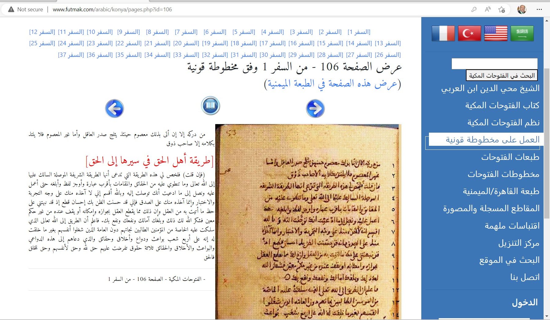 Timeline photosبعد توقف لعدة سنوات بسبب الانشغال بنظرية ازدواجية الزمان، سنستأنف العمل إن شاء الله تعالى على إخراج وترجمة كتاب الفتوحات المكية لسيدي الشيخ الأكبر محي الدين ابن العربي رضي الله عنه وأرضاه ... وسوف يتم تحديث الأجزاء بشكل مستمر على الموقع (http://www.futmak.com/arabic/konya) ... ومع أنَّ الهدف الأساسي هو الترجمة إلى اللغة الإنكليزية (http://www.futmak.com/english) ، إلا أنَّ هذا الأمر لا يمكن أن يتم دون دراسة متأنِّية تتضمن إضافة بعض الشروحات والتعليقات وتقسيم النص إلى فقرات بحسب الموضوعات المطروقة ثم ربط هذه الفقرات ببعضها عن طريق الفهارس والتعليقات التي في الهوامش. لذلك، بالإضافة لكونها أصلاً للطبعة المترجمة، فإنَّ الطبعة العربية ستكون ذات فائدة كبيرة للقارئ العربي، ويمكن استخدامها بشكل مستقل تماماً. كذلك، فإنَّ الشروحات والهوامش والتعليقات في هذه الطبعة ستكون مخصصة للقارئ العربي، ولن يتم تضمينها كلها في الطبعة المترجمة والتي تحوي شروحات وهوامش وتعليقات أخرى لا تكون ضرورية للقارئ العربي.لا يرى الرائي من المرئي إلا قدر منزلته ورتبته (هو) فما رأى إلا نفسه، ولو لا ذلك ما تفاضلت الرؤية في الرائين إذ لو كان هو المرئي ما اختلفوا ...